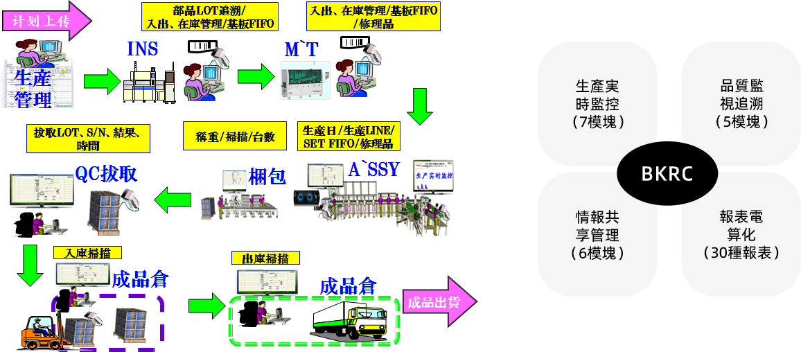 生産計画から、実装、M`T 、本体、梱包、入庫、出庫まで